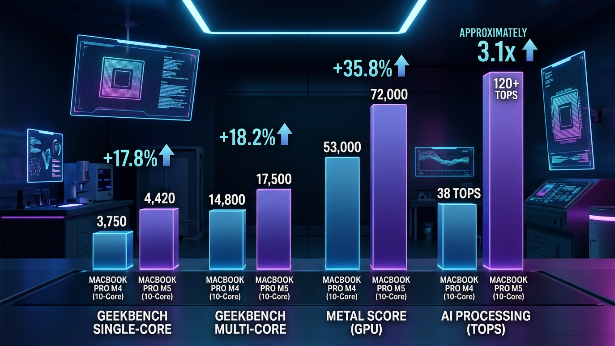 | 테스트 항목 | MacBook Pro M4 (10-Core) | MacBook Pro M5 (10-Core) | 성능 향상 폭 |